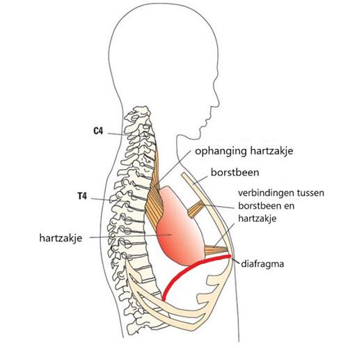 Door de verbinding tussen het hartzakje, middenrif en borstbeen, hebben zij invloed op elkaar. Tijdens rust wordt de inademing uitgevoerd door het middenrif. Door de aanspanning daalt dit en neemt het tegelijkertijd het hart mee naar beneden. Door deze daling van het hart komt er ook spanning te staan op het ophangsysteem. Tijdens de uitademing ontspant het middenrif en stijgt dit; het hart stijgt hierbij mee. Het ophangsysteem kan zich weer ontspannen. Tijdens inspanning wordt de ademhaling dieper waarbij de borstkas zich uitzet en borstbeen naar voren komt; het hart wordt wederom meegenomen.