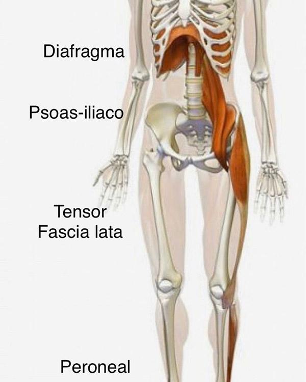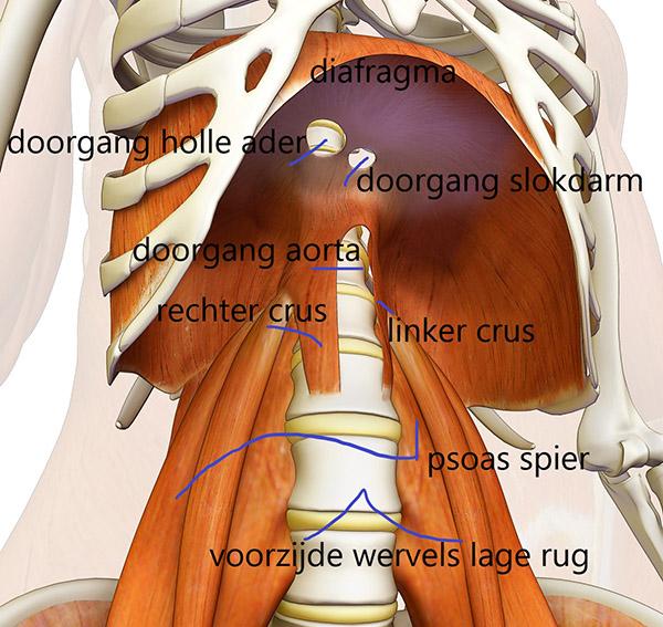 Het middenrif, of het diafragma, is een grote koepelvormige spier die buikholte scheidt van de borstholte. Het middenrif zit vast aan de binnenzijde van de lage ribben, aan de achterzijde van het borstbeen en via twee ‘steunpilaren’ – ook wel de crussen genoemd- vastzitten aan de voorzijde van de wervels ter hoogte van de overgang van de borstwervels naar de lage rugwervels. Direct naast deze crussen liggen de beide psoasspieren. De psoas verloopt langs de lage ruggenwervels. Daarnaast is deze ook aan de ruggenwervels verbonden waardoor hij veel invloed heeft op de stand van de wervelkolom. Uiteindelijk zit de psoas vast aan het binnenzijde van het bovenbeen, ter hoogte van lies.