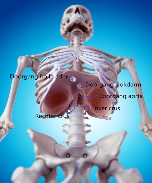Doordat de slokdarm door het middenrif naar de maag toegaat, is het middenrif ook zeer belangrijk voor de slokdarm. De slokdarm kan in voortdurend verlengde positie komen, wanneer het middenrif in basis lager ligt. Dit kan komen doordat er aan het middenrif getrokken wordt door littekens in de buik die ontstaan na bijvoorbeeld een galblaas- of blindedarmoperatie of keizersnede. Ook andere ontstekingen in de buik kunnen aan het middenrif trekken en deze laten dalen: darmontstekingen, maag- of duodenale zweren, divertikels, blaasontstekingen, et cetera. De lagere ligging van het middenrif en de verlengde positie van de slokdarm kan maagzuuroprispingen in de hand werken en/of spanningen op het ophangsysteem van de slokdarm geven. Ook dit kan zorgen voor nek- en hoofdpijnklachten.
